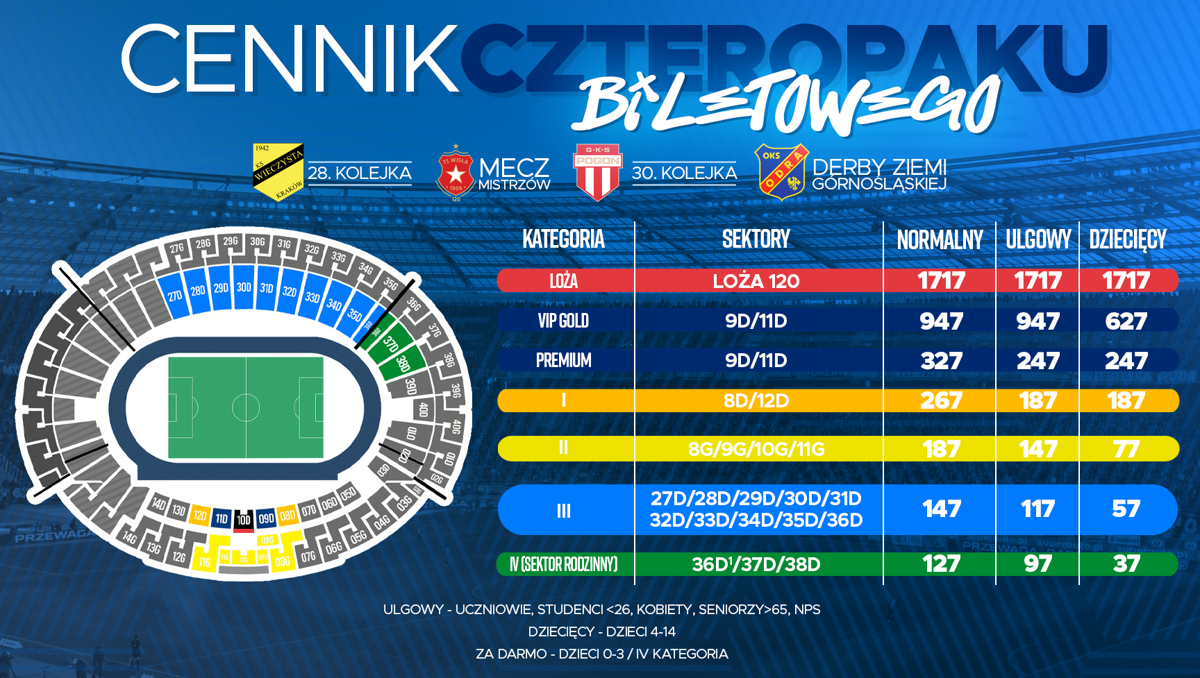 Za jednym zamachem możecie nabyć pakiet biletów na wszystkie cztery spotkania. To komfort, oszczędność czasu i pieniędzy, a także gwarancja wybranego miejsca na #MeczMistrzów z Wisłą Kraków (sprzedaż biletów na to wydarzenie ruszy niebawem). Kupując czteropak, zyskujesz do 15% względem kwoty, którą należałoby wyłożyć za cztery pojedyncze wejściówki. Czteropak obowiązuje w formie pojedynczego wydruku lub pojedynczego pliku PDF.